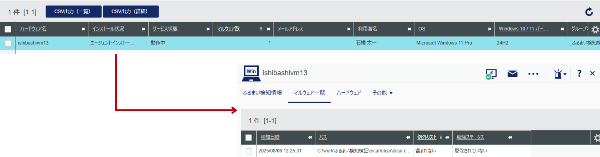 管理画面からはふるまい検知でウイルスを検知した端末一覧と、検知したウイルスの詳細やステータスを把握することができます。